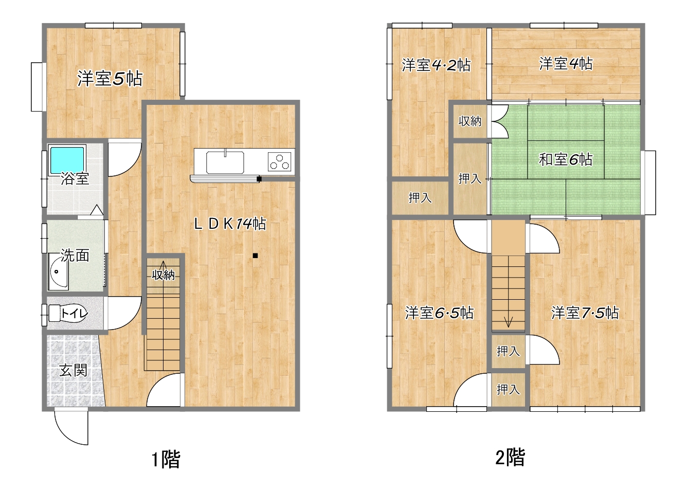 | 間取り内訳 | 6LDK: 1階洋4.2・LDK14 2階洋6.5・洋7.5・和6・洋4・洋3 |