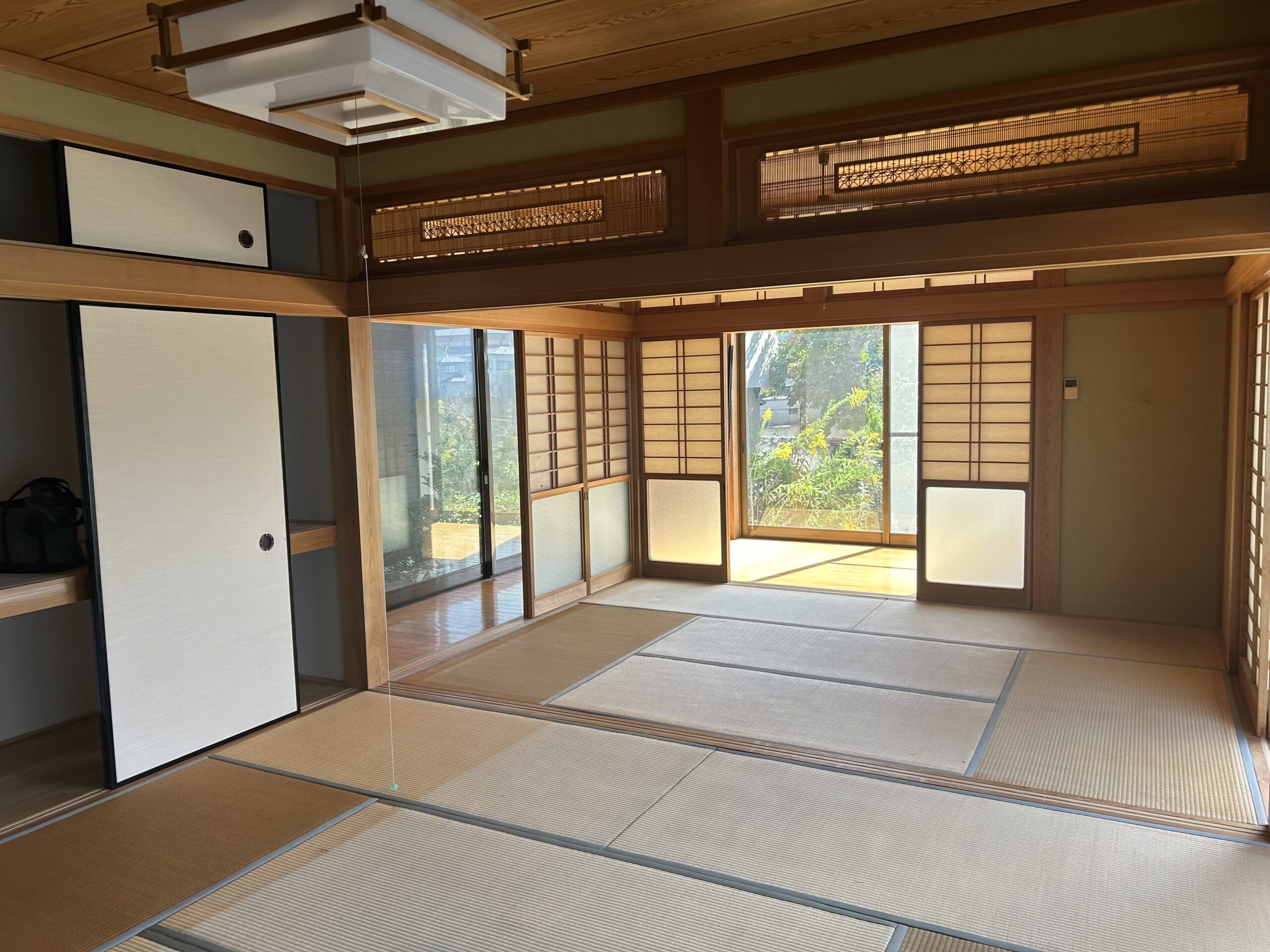 和風住宅に ビルトイン車庫。車や趣味のスペースに使用することも出来ます。二間続きの和室には縁側もあり、雨の日にも洗濯物が干せるサンルームもあります。ちょっとした荷物は2階の屋根裏部屋収納出来ます。7LDKと広い住宅ですのでトイレが2箇所あるのもうれしいですね。海と山、近くには長与町総合公園もありプライベートを充実したい方、ちょっと贅沢してみませんか。いい家です。