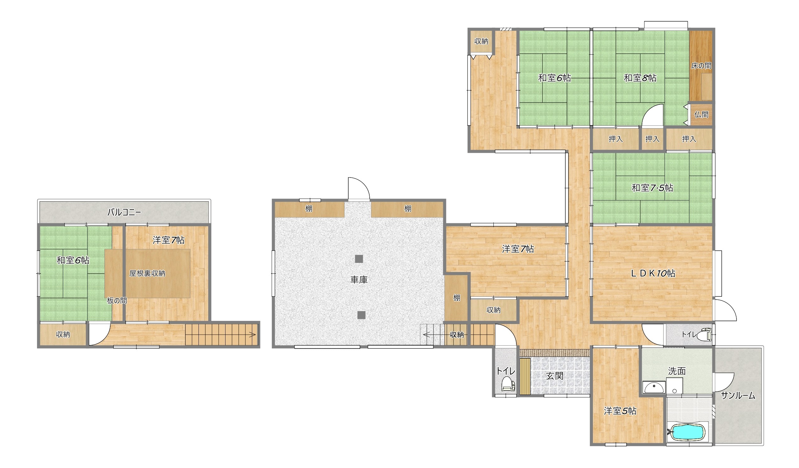 | 間取り内訳 | 7LDK ビルトイン車庫: 1階 和8・和6・和7・洋7・洋5・LDK10・広縁 車庫2台 2階和6板間1帖・洋7・屋根裏部屋 |